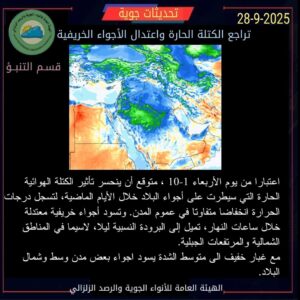 وأضافت الهيئة أن، “الأجواء في بعض مدن الوسط والشمال قد تشهد غباراً خفيفاً إلى متوسط الشدة”، مشيرةً إلى أن “التغيرات المناخية الحالية تمثل بداية فعلية لاعتدال الطقس ودخول البلاد أجواء الخريف”.