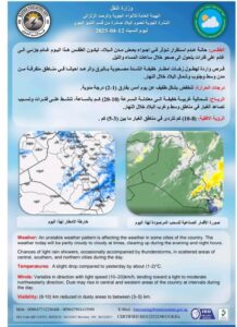 أعلنت هيئة الأنواء الجوية، اليوم السبت (12نيسان 2025)، عن حالة الطقس في البلاد، متوقعة عدم استقرار الأجواء، مع فرص لهطول أمطار خفيفة مصحوبة بالبرق والرعد في مناطق متفرقة.