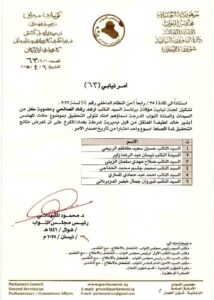 وتألفت اللجنة النيابية المؤقتة وفقاً للأمر النيابي، الذي تلقاه موقع الشاخص الإخباري، برئاسة أرشد الصالحي وعضوية 6 نواب آخرين على ان تعرض نتائج التحقيق لمدة أقصاها اسبوع واحد اعتباراً من تاريخ اصدار الأمر.