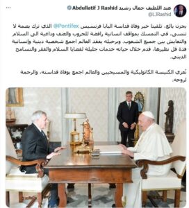 أعرب رئيس الجمهورية عبد اللطيف رشيد، اليوم الاثنين (21 نيسان 2025)، عن بالغ حزنه لوفاة البابا فرنسيس، مشيدًا بمواقفه الإنسانية الداعية للسلام والتعايش ورفض العنف، مؤكداً أن رحيله خسارة للعالم أجمع.