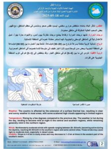 تشهد البلاد، اليوم الأحد 18 أيار 2025، أجواءً مستقرة وصحوة، مع تأثير امتداد منخفض حراري سطحي يرافقه طقس مشمس وظهور سحب عالية متفرقة في بعض المناطق.